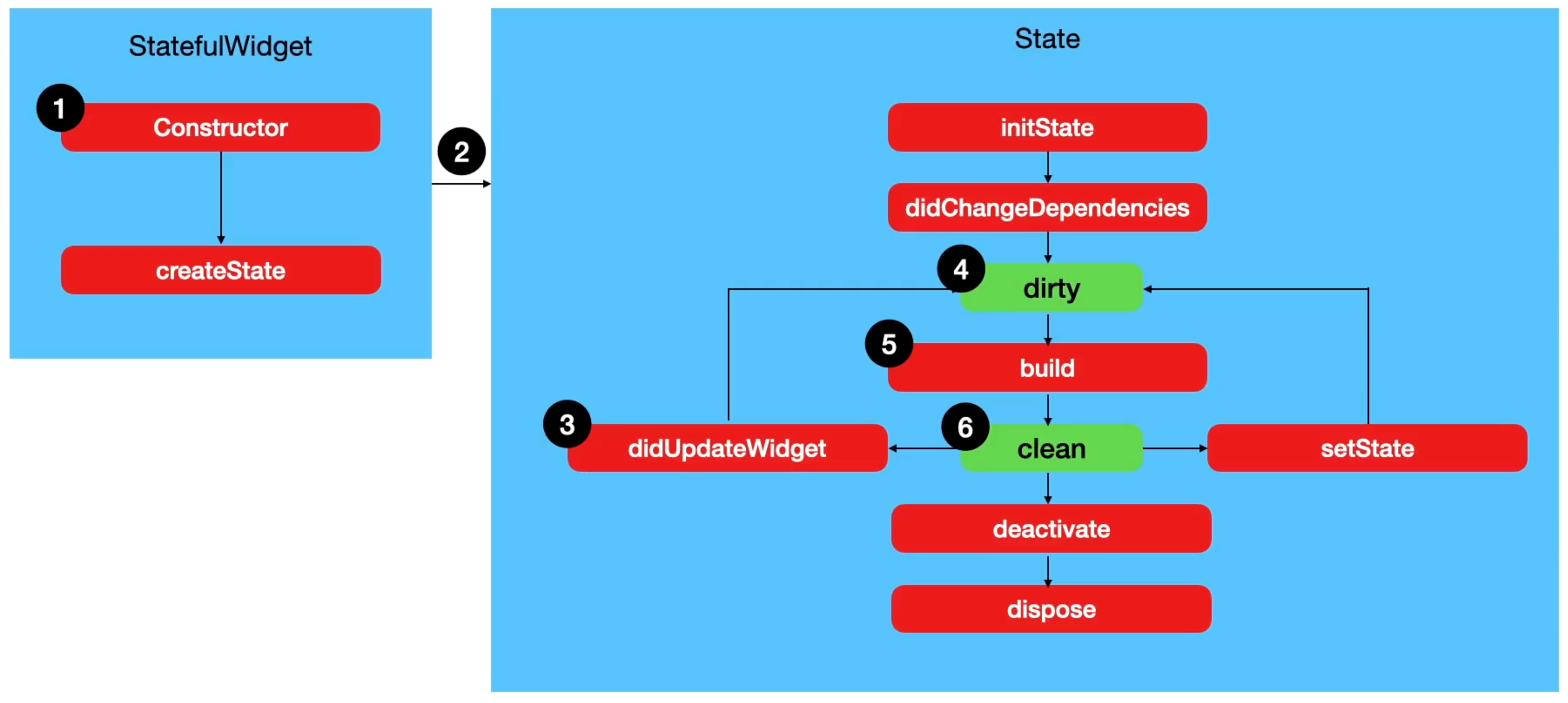 _CodeWidgetState 생성 -> initState() 1번만 실행함 -> didChangeDependencies() -> dirty -> build() -> clean -> deactivate() 화면에서 지워졌을 때 실행 -> dispose() 화면에서 지워졌을 때 실행