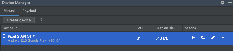 우측 상단(AVD Manager) 아이콘을 누르고 Create virtual device를 눌러 실행시킵니다.