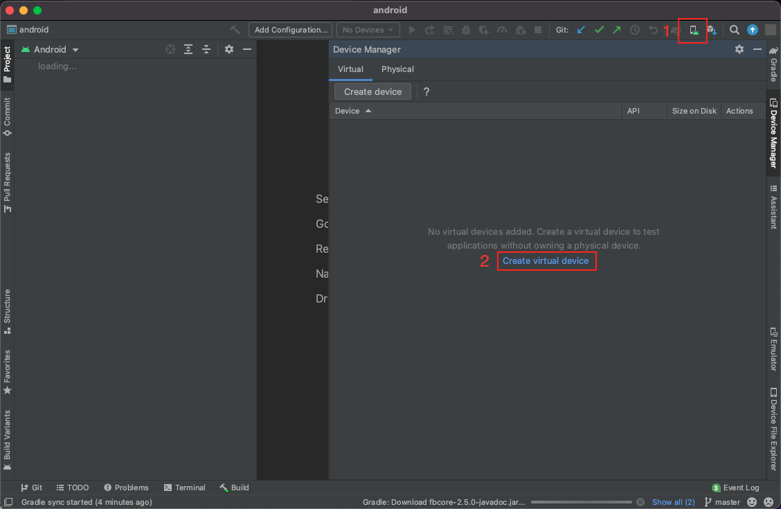안드로이드 스튜디오에 android 폴더를 열어 실행시킵니다.